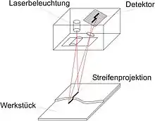 The light section is a technology for optical 3-D measurement, which makes the measurement of a height profile along a projected line of light. It is based on the principle of triangulation.[1]