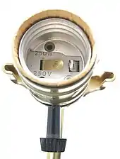 A lightbulb socket, lightbulb holder, light socket, lamp socket or lamp holder is a device which mechanically supports and provides electrical connections for a compatible electric lamp.[1] Sockets allow lamps to be safely and conveniently replaced (re-lamping). There are many different standards for lampholders, including early de facto standards and later standards created by various standards bodies. Many of the later standards conform to a general coding system in which a socket type is designated by a letter or abbreviation followed by a number.[2]