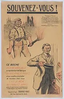 Ligue Souvenez-vous! (Remember! League) was a patriotic organisation established in France on 16 February 1916 in order to ensure that French public opinion remained aware of the atrocities committed by the German Army in the 1914 invasion of France.[1] Jean Richepin, active as a franc-tireur during the Franco-Prussian War was their honorary president. Richepin was keen to sustain what he termed a "sacred hatred" for "German Barbarism" which he regarded as threatening the values of "justice, charity, law, liberty and light" which he regarded as characterising French civilisation.[1] Antonin Dubost, Paul Deschanel, Alexander Izvolsky (Russian Ambassador), Baron Guillaume (Belgian Minister) and Milenko Radomar Vesnić (Serbian Minister in Paris) also supported the league.