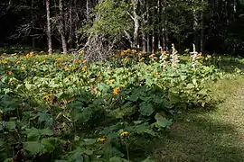 Ligularia dentata is grown as an ornamental plant, chosen as much for its bold foliage as its flowers.[6] It is used as a round-leaved accent plant or massed planting in moist sun and partial shade garden settings, and in containers. Cultivars include 'Desdemona' and 'Othello'. Selections with cream colour spotted foliage (polka dots) are also grown.