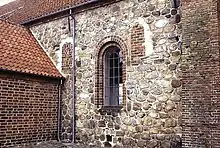 Built in the Romanesque period, the church initially consisted of chancel and nave constructed in stone with the use of stone ashlars at the corners. In the Gothic period, the nave was extended westwards. The lower part of the extension is constructed in stone from the original church while the upper part is built of brick. The crow-stepped west gable has arched niches. A porch was at the same time added on the west side of the church. The tower was built on top of the chancel in 1859 and heightened in 1906.[1]