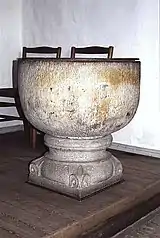 The original flat ceiling of the chancel and nave was in the Gothic period replaced with a cross-vaulted ceiling. The altarpiece is a painting by J. L. G.Lund from the middle of the 19th century. The Baroque style pulpit was created by Hans Snedker in 1631. The altar and chancel was refurbished by Mogens Koch in 1952. The font is from Scania and made of sandstone. [1]