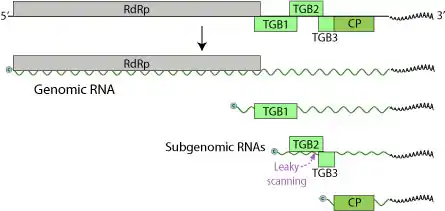 TGBp2 and TGBp3 are membrane binding proteins involved in attachment and entry. TGBp3 is expressed through leaky scanning of the TGBp2 subgenomic mRNA. The TGBp2 ORF has a weak initiation codon that is sometimes skipped by the ribosome in translation initiation. In this instance, the 40S ribosomal subunit continues to scan until it encounters the initiation codon of TGBp3 and begins translation.