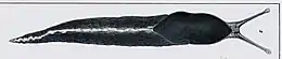 Limax amaliae shows a thin, somewhat irregular white central line. The body is deep black to greyish black. The mantle is less dark. On the longitudinally three-parted sole, the marginal areas are bluish-gray, while the middle one is pale. The back has very strong, heavily pleated longitudinal folds and furrows. The anatomy is not yet known.