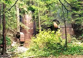 From 1887 to 1890 the Rockland Lime and Lumber Company harvested limestone from a scree slope and fed it into four iron and stone lime kilns they erected onsite. Long exposure to very hot fires extracted lime.[1] Barrels of lime were slid on a cable out to Rockland Cove, where they were loaded onto ships. The lime was a key ingredient in the cement that was used for construction in San Francisco and Monterey.[3] However, after three years the company had exhausted most of the limestone as well as the redwood used to fire the kilns. A .5-mile (0.80 km) trail leads from the Big Sur Coast Highway to the ruins of the lime smelting operations, which include four kilns and some stone walls and bridge abutments.[1]