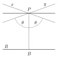 A ray is a limiting parallel to a ray if they are coterminal or if they lie on distinct lines not equal to the line , they do not meet, and every ray in the interior of the angle meets the ray .[1]