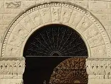 The exterior of the school was simple and bold in massing. The hipped roof rose 41 feet (12 m) at the ridgeline and included cross gables on three sides of the building.[2] A flared and rusticated limestone base reinforces the visual weightiness of the building.