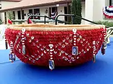 2010[26] - The Oakland Museum was organizing a new exhibit of baskets from the various indigenous peoples of California, and found they had no baskets from any of the Ohlone tribes that once populated the broader San Francisco Bay Area. Yamane had been a member of the museum's Native Advisory Counsel, as well as actually a consultant on the basket collection. The museum commissioned her to make a ceremonial basket in the Rumsien style and by Rumsien methods, which was unveiled to the public in 2012. The piece had over 20,000 stitches and 1,200 Olivella beads made by Yamane. The several thousand feathers on the basket were chicken feathers died red, because it is no longer legal to collect feathers from the acorn woodpecker, the traditional source.[3][20][26] In addition, Yamane led multiple living history basket weaving demonstrations at the museum.[3]