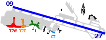 The airport has one runway, designated 09/27 for its magnetic headings of 095 degrees (106 True) and 275 degrees (286 True). The runway, built of asphalt and concrete, measures 9,400 by 200 feet (2,865 m × 61 m). Each end has a displaced threshold: on Runway 27, the first 1,810 feet (550 m) are displaced, while the first 1,000 feet (300 m) are displaced on Runway 9.
