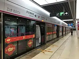 Line 6 of the Tianjin Metro (Chinese: 天津地铁六号线; pinyin: Tiānjīn Dìtiě Liù Hào Xiàn) is a rapid transit line running semi-circular from north-east to south-east Tianjin. It was opened on 6 August 2016.[1] The line was later extended on 31 December 2016 and on 26 April 2018.[2] The line is currently 42.6 km long and has 38 stations. The line currently uses 6 car B size trains but the platform is long enough to support 8 car trains as demand grows in the future. Line 6, together with Line 5 will form a loop around Tianjin.