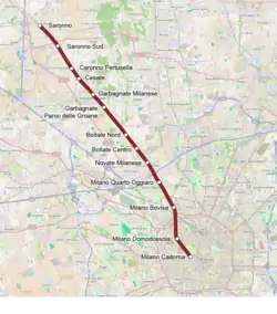 Line S3, a radial route, runs from Saronno in a south easterly direction, via the Milan–Saronno railway, to Milano Cadorna, the railway's urban terminus.[2] The travel takes 35 minutes.[3]