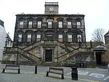 A six-stage tower, which, as well as being balustraded, was originally surmounted by a belfry and weather vane, was erected to the immediate north of the town house in 1678.[1] The steps to the first floor of the town house were replaced by a wrought iron loggia, which facilitated access to the market hall, in 1810,[1] and a northern wing, designed by William Burn and built behind the right hand three bays of the town house at a cost of £1,706, was completed in 1821.[6] Following a serious fire in 1847, the town house was restored to a design by Thomas Brown in 1848.[1] A clock, designed and manufactured by Messrs Mackenzie of Glasgow, was installed in to tower in 1857: it was the first turret clock in Scotland to use the same gravity escapement principles that had been developed for the clock in the tower at the Palace of Westminster.[7]