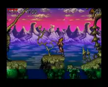 The game is divided into 14 levels, some of which feature end-of-level boss fights.[5] At first, the player has four health points, three lives and two continue options. Health points are lost whenever Valdyn is hit, and a life is lost whenever health reaches zero, or Valdyn suffers a fatality as in when falling into a chasm.[4] There are a number of power-ups (usually in hidden sections of each level) like "Energy Drinks" that replenish health, and "Life Spheres" which grant more lives. Each level has several "Energy Crystals" which the player can collect. Every 100th crystal "unlocks" one life point out of four more available; optimal performance means that the player can have a maximum of eight life points before the end of the game, making survival easier. The player can also find more powerful swords; the more powerful a sword, the less hits are required to kill a stronger opponent.[4][3]