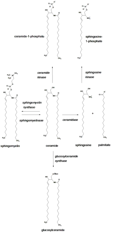 Ceramide (Cer) can be generated by the breakdown of sphingomyelin (SM) by sphingomyelinases (SMases), which are enzymes that hydrolyze the phosphocholine group from the sphingosine backbone. Alternatively, this sphingosine-derived lipid (sphingolipid) can be synthesized from scratch (de novo) by the enzymes serine palmitoyl transferase (SPT) and ceramide synthase in organelles such as the endoplasmic reticulum (ER) and possibly, in the mitochondria-associated membranes (MAMs) and the perinuclear membranes. Being located in the metabolic hub, ceramide leads to the formation of other sphingolipids, with the C1 hydroxyl (-OH) group as the major site of modification. A sugar can be attached to ceramide (glycosylation) through the action of the enzymes, glucosyl or galactosyl ceramide synthases.[1] Ceramide can also be broken down by enzymes called ceramidases, leading to the formation of sphingosine,[2][3] Moreover, a phosphate group can be attached to ceramide (phosphorylation) by the enzyme, ceramide kinase.[4] It is also possible to regenerate sphingomyelin from ceramide by accepting a phosphocholine headgroup from phosphatidylcholine (PC) by the action of an enzyme called sphingomyelin synthase.[5] The latter process results in the formation of diacylglycerol (DAG) from PC.