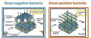 Lipoteichoic acid (LTA) is a major constituent of the cell wall of gram-positive bacteria. These organisms have an inner (or cytoplasmic) membrane and, external to it, a thick (up to 80 nanometer) peptidoglycan layer. The structure of LTA varies between the different species of Gram-positive bacteria and may contain long chains of ribitol or glycerol phosphate. LTA is anchored to the cell membrane via a diacylglycerol.[1] It acts as regulator of autolytic wall enzymes (muramidases). It has antigenic properties being able to stimulate specific immune response.