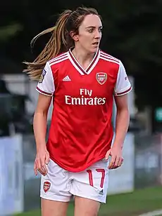 On 29 June 2017, Evans signed for Arsenal.[17] Due to injuries and competition for places in her usual playing position, coach Joe Montemurro sometimes deployed Evans as a full-back: "One week I find myself on the left wing and then the other I find myself at right-back but it's something I've really enjoyed. It's made me an all-around better player."[18] She extended her contract with the FA WSL club in December 2018.[19] During her first season with Arsenal in 2017–18, Evans played 18 regular season games, scoring two goals, went on to win the WSL Cup and was a Women's FA Cup finalist. Her second season with the club saw her play another 18 regular season games and help Arsenal to a runner-up position in the WSL Cup and finish as champions in the FA WSL. Evans played her 50th match with the club overall on 31 March 2019 against Birmingham City W.F.C.;[20] Arsenal won the game 1–0 and as a result qualified for the Champions League for the first time since 2014.