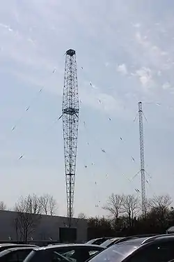 The station includes three radio masts, including two standard lattice masts and one Blaw-Knox diamond cantilever vertical radiator. The two standard lattice masts have a wire slung T-antenna suspended between them. The Blaw-Knox radiator is the only one of its kind in Western Europe. The height of a vertical radiator is related to the frequency (or wavelength) of the service transmitted, and for maximum efficiency should be one half of the station's wavelength. Its height was originally 144.8 metres (475 ft), but it was shortened when the station's broadcast frequency was changed.
