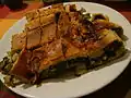 meat dish | cold, sliced veal covered with a creamy, mayonnaise-like sauce that has been flavored with tuna. It is considered a traditional Christmas dish.[6][7] |