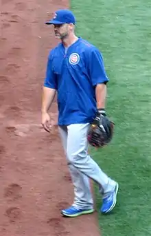 When manager Joe Maddon became a free agent near the end of 2014, the Cubs fired Rick Renteria after only one season to bring Maddon on to lead the club.[12] He was signed to a five-year, $25 million contract.[13] From 2015 through 2019, Maddon led the team to the playoffs four times. He was awarded the 2015 Manager of the Year Award[10] and went on to help the club break its 108-year World Series drought in 2016. Epstein and Maddon announced in a joint press conference that the Cubs would let Maddon's initial five-year contract expire. The team brought on former-Cubs catcher David Ross to replace Maddon, signing him to a three-year contract.[14]