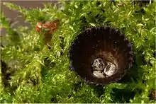 St Lucia, Trinidad, Guadelope, Jamaica, Mexico, Bolivia | 8–10 × 7–8 | Mouth of cup has stiff, dark setae 0.5–1 mm long; outside surface with fine appressed hairs and some longer tangled hairs; inside surface barely plicate, silvery; basal emplacement narrow (1.5–2 mm wide); epiphragm thin, white to pale buff; peridioles angular, black, shiny, 2.5 or more wide. | 17–24 × 10–14[40] |