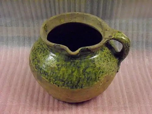 English medieval pottery was produced in Britain from the sixth to the late fifteen centuries AD. During the sixth to the eighth centuries, pottery was handmade locally and fired in a bonfire. Common pottery fabrics consisted of clay tempered with sand or shell, or a mix of sand and shell. Pottery forms were common items used for cooking and storage, and were undecorated or decorated simply with incised lines. By the eighth century, the slow wheel was being used by local craftsmen to finish pots. By the late ninth century, potters in urban areas started to mass-produce their products. A larger variety of forms were being made and decorated in new ways. During the tenth century, potters began transitioning to a fast wheel and firing pots in kilns.[1] Grooved lines, thumbed-applied strips, stamping and rouletting were commonly used decorations. From the thirteenth to the fifteenth centuries, glazed and slip pottery appeared more frequently in the marketplace, along with new fabric colours and decorations, and a large number of new forms.[2][3]