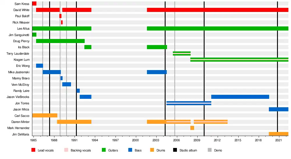 After the recording of the demo with Baloff, Jastremski was replaced by Manny Bravo.[7] Baloff left at the beginning of 1989.[6] He was replaced briefly by David Wayne (formerly of Metal Church), followed by Rick Weaver, before Godfrey (now using the name David White) returned in time for the recording of demo Opiate of the Masses in March.[7] The demo also featured new bassist Vern McElroy of Blind Illusion; in 1990, the band recorded Victims of Deception with session stand-in Marc Biedermann, before Randy Laire took over.[5] During his first tour, Laire died in a car accident in September 1991.[8] He was replaced by Jason VieBrooks.[9]