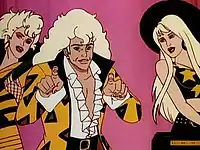 Phoebe "Rapture" Ashe (voiced by Ellen Gerstell, singing voice recorded by Vicki Sue Robinson) makes up the third of the Golden Triumverate, where she was the guitarist and backup vocals. Rapture is a skilled con artist and is quite knowledgeable in matters of the occult, using that knowledge to further her own agenda (and often that of the Stingers, as well). She persuaded Mrs. Farnsworth to let the Stingers play a charity concert by pretending to channel the spirit of Houdini in "That Old Houdini Magic". She milked several Greek townspeople out of their money pretending to be an Oracle in "Midsummer Night's Madness". Rapture even maneuvered herself into a position to exchange a "chunk of crummy quartz" she got from Pizzazz for a bracelet made of gold and diamonds in "The Stingers Hit Town". While self-centered and arrogant, Rapture is intelligent, quick-thinking, and has a great deal of performance ability to pull off her scams. She cares greatly for her bandmates and willingly takes orders from Riot on a business level – she knows all too well that his charm and charisma will take him places where she also wants to go. She has no romantic interest on the show.