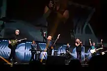 In 1999, Kansas reunited with original lead guitarist Kerry Livgren, who had written and produced demos for several new songs described by drummer Phil Ehart as sounding "like classic Kansas".[24] Recording started in early 2000 for a new album, Somewhere to Elsewhere, at the guitarist's own Grandyzine Studios in Topeka, where the group had originally formed.[25] The album was released in July and also featured original bassist Dave Hope on two tracks, marking the first time the band's original lineup had featured together on a recording since 1980.[26] Livgren remained only for the recording, with the previous lineup of the group returning to tour later in the year.[27]