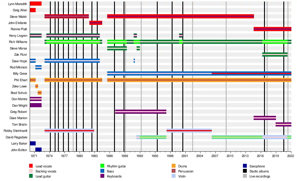 Kansas was formed in early 1973, with the original lineup comprising Steve Walsh, Robby Steinhardt, Kerry Livgren, Rich Williams, Dave Hope and Phil Ehart.[1] Throughout the 1970s, the band issued a series of critically and commercially successful releases, including US Billboard 200 top ten albums Leftoverture and Point of Know Return.[2] The group's first lineup change came in October 1981, when frontman Walsh left the band during the early stages of writing for their eighth studio album Vinyl Confessions.[3] Speaking in a 2015 interview, Ehart recalled that "Things were hurtling so fast that there was no way to avoid hitting a breaking point," agreeing that Livgren's lyrical content influenced Walsh's departure, but adding that "that was one of many things going on that was making it difficult to be a band."[4]