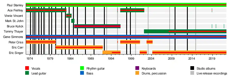 Kiss is an American hard rock band from New York City, New York. Formed in January 1973, the group originally featured rhythm guitarist Paul Stanley, bassist Gene Simmons, lead guitarist Ace Frehley and drummer Peter Criss, all of whom contributed to vocals.[1] The band's lineup remained stable for seven years, before Criss left on May 17, 1980 after an injury and increasing personal tensions.[2] He was replaced by Eric Carr, after Anton Fig filled in for 1979's Dynasty and 1980's Unmasked.[3] Two years later Frehley also left the band.