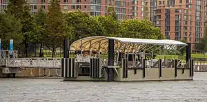 Located on the India Street Pier at 10 India Street in Greenpoint, Brooklyn along the East River. Served only by the East River route. In late May 2021, structural problems were identified and the stop has been closed indefinitely until further notice.