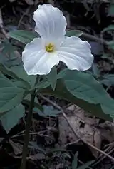 The state wildflower of Ohio is the large white trillium (Trillium grandiflorum). In 1982, the Native Plant Society of Northeastern Ohio assembled with a goal of nominating and selecting a flower that was "native" to Ohio to unseat the scarlet carnation. On April 26, 1983, the group selected the large white trillium to take on the role as state wildflower, which they brought to state representatives in 1984. A year later, State Representative Bob Clark, a member of the House Natural Resources Committee, sponsored a bill to name the large white trillium the official state wildflower of Ohio, leading the scarlet carnation as state flower. Trillium was chosen by the Society because it was present in all 88 counties of Ohio, could be easily recognized, and was not endangered. | ||