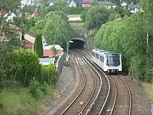 Parts of the system have been upgraded from light rail to metro standard. The Østensjø and Lambertseter Lines were converted in 1966, when the first sections of new metro line were opened.[20] The Sognsvann and Røa Lines, as well as the western part of the Common Tunnel, were upgraded in 1993 and 1995.[21] The Holmenkollen and Kolsås Lines were upgraded and subsequently re-opened in 2011 and 2014, respectively.[22][23] Following the upgrade, all T1000 stock can be retired and replaced by the new MX3000 trains.[24] The Grorud and Lambertseter Lines serve the Groruddalen valley while the Østensjø and Lambertseter Line serve the southern areas of Nordstrand.[25] These four lines have the highest ridership.[26] In the west, the Kolsås, Røa, Holmenkoll and Sognsvann Lines serves less densely populated areas. The Ring Line serves the northern borough of Nordre Aker, while the Common Tunnel serves the city center.[25]