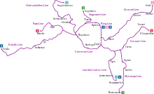 The following table presents the eleven lines of the Oslo Metro. They are chronologically sorted by the date of the first section of line to open.[27] The service column indicates which of the six numbered services operates on most of the lines.[9] Services are omitted from lines where they serve only one or two stations. The date indicates the official opening date of the line on the section noted in the fourth column. Sections with blue background indicate lines that were opened as tramways, while white background indicates the line was converted to or built as metro standard.[27] The length column indicates the total length of the line at the time of opening or upgrade, and the extension column indicates the length of the extension. The station column indicates the number of stations on the line after the opening of each extension or upgrade.[28][29][30][31] Unless specified otherwise, the lines are metro standard.