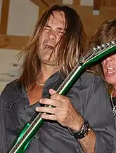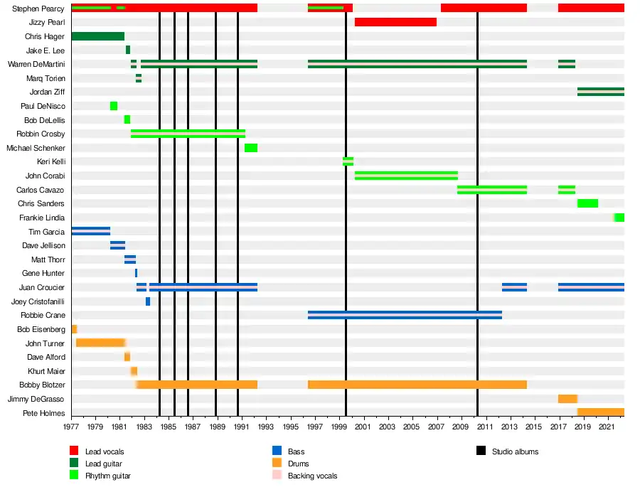 The lineup lasted only a few months, with Alford and Lee quitting after Pearcy fired DeLellis without consulting them.[8] The pair subsequently formed Rough Cutt together.[9] Thorr remained the band's bassist, alongside new additions Warren DeMartini and Robbin Crosby on guitars, and Khurt Maier on drums.[10] This lineup recorded "Tell the World" for the first edition of the Metal Blade compilation Metal Massacre.[11] Thorr was briefly replaced by Gene Hunter,[12] however by the end of the year the group had finalised its classic lineup of Pearcy, DeMartini, Crosby, bassist Juan Croucier and drummer Bobby Blotzer.[13] Marq Torien briefly joined on guitar in 1982.[14] Joey Cristofanilli temporarily took over from Croucier in 1983, but he returned once he left Dokken later in the year.[15]