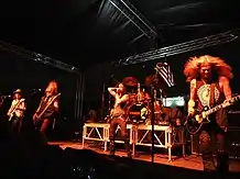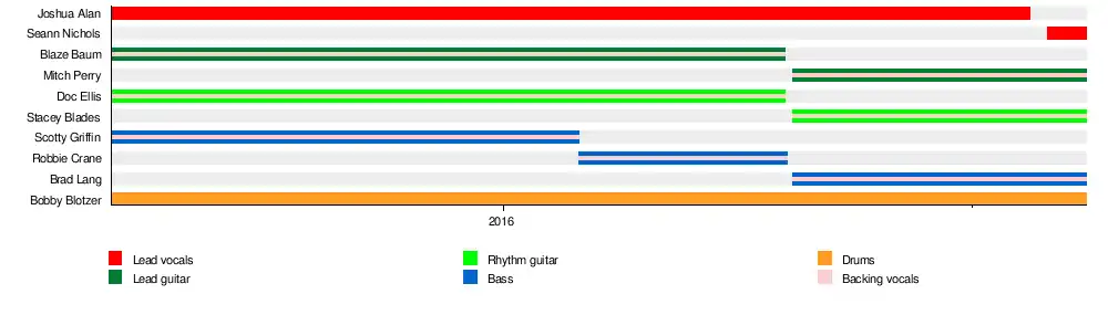 Croucier returned to take Crane's place in May 2012.[31][32] Blotzer was temporarily replaced for a run of shows in early 2014, as he had yet to recover from neck surgery he underwent the previous October.[33] In April 2014, Pearcy announced that he had left Ratt for a third time, blaming the "constant turmoil" and other controversies surrounding the band.[34] The following September, Blotzer rebranded his new group from Bobby Blotzer's Ratt Experience to simply Ratt, having "taken control" of the brand, with the drummer joined by lead vocalist Joshua Alan, guitarists Michael "Doc" Ellis and Nicolas "Blaze" Baum, and bassist Scotty Griffin.[35] DeMartini later sued Blotzer over the use of the Ratt name,[36] however this was denied by a court ruling.[37] Griffin was replaced by Robbie Crane in February 2016,[38] and both Blaze and Crane left in August.[39][40] They were replaced initially by Stacey Blades and Todd Kerns, respectively,[41] and later on a more permanent basis by Mitch Perry and Brad Lang.[42] Blades remained as a replacement for Ellis.[43] Alan left the band in January 2017 to pursue other projects.[44] He was replaced by Seann Nichols, although the band performed only one show and has been inactive since March 2017.[45]