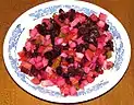 Diced boiled vegetables (beet roots, potatoes, carrots), chopped onions, and sauerkraut and/or pickled cucumbers.[19][20][21] Other ingredients, such as green peas or beans, are sometimes also added.[20][21] Dressed with vinaigrette, mayonnaise or simply with sunflower or other vegetable oil. |