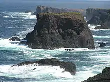 The geology of Shetland is complex with numerous faults and fold axes. These islands are the northern outpost of the Caledonian orogeny and there are outcrops of Lewisian, Dalradian and Moine metamorphic rocks with similar histories to their equivalents on the Scottish mainland. Similarly, there are also Old Red Sandstone deposits and granite intrusions. The most distinctive feature is the ultrabasic ophiolite, peridotite and gabbro on Unst and Fetlar, which is a remnant of the Iapetus Ocean floor.[6] Much of the island's economy depends on the oil-bearing sediments in the surrounding seas.[7] In the post-glacial epoch, c. 6200 BC, the islands experienced a tsunami up to 20 metres high caused by the Storegga Slides, an immense underwater landslip off the coast of Norway.[8][9]