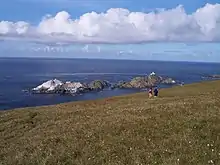 This is a continuing list of uninhabited smaller Shetland islands, tidal islets only separated at higher stages of the tide, and skerries which are only exposed at lower stages of the tide. Many of these islets are called "Holm" from the Old Norse holmr, meaning a "small and rounded islet". "Swarta Skerry" (Old Norse:' svartar sker) – "black skerry" is also a common name, as are "Linga", meaning "heather island", "Taing" (Old Norse: tangi) meaning "tongue" and "Flaesh" (Old Norse: fles) meaning "flat skerry".[24] "Hog" and "calf" are used to indicate a small island, in the latter case usually adjacent to a larger one.[25][26]