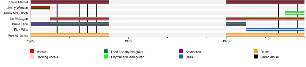 Winston left the band for a solo career shortly after.[5][6] In a 2000 interview, Kenney Jones 'stated' the reason Winston was fired from the band was because "He (Winston) got above his station and tried to compete with Steve Marriott." Reality is he left.[7] Ian McLagan, of the Muleskinners, replaced Winston as the keyboardist.[5] McLagan played his debut performance with them on 2 November 1965.[8] After "Sha-La-La-La-Lee" became their first top ten hit, the Small Faces enjoyed widespread success, particularly in the UK and mainland Europe. It is commonly rumoured the group split on New Year's Eve of 1968, when Marriott stormed off stage, stating "I Quit".[9] The truth is that they were actually obligated to perform a few scheduled live performances during the earlier parts of 1969 before finally splitting, with Marriott forming Humble Pie, and the remaining Small Faces created Faces with Rod Stewart and Ronnie Wood.