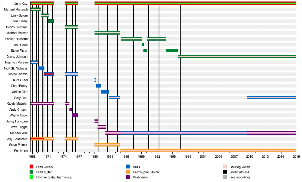 Ritchotte left Steppenwolf in 1989 to tour with the David Lee Roth Band,[18] returning the following year and remaining until late 1993.[17] During his time away from the band, he was replaced briefly by Les Dudek,[19] and later by Steve Fister.[20] Following his departure, Fister returned to Steppenwolf for another three-year run.[21] In 1996, Danny Johnson joined Steppenwolf in place of the departed Fister.[22] Bassist Gary Link rejoined the band in 2009.[23][24] In October 2018, at the end of the band's 50th anniversary tour, Kay announced that the group had officially retired.[25]