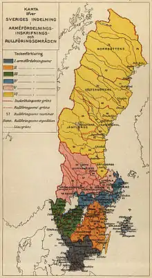 The concept of arméfördelning ("army division"), originally only fördelning ("division") began to be used after the beginning of the 19th century, and was introduced in 1889 as a term also in the peace-time organization.[2] Through the 1892 and 1897 changes made in the organization of the army, the artillery was also placed under the commanding officers of the army divisions. An army division then, apart from some exceptions, consisted of four infantry, one cavalry and one artillery regiment, and one service corps, for which at war, engineer troops were added.[2] The army division is intended for independent operations, but lacks complete administrative bodies in peacetime. Sweden was divided into six army division areas in 1904, with command offices in Helsingborg (1st), Linköping (2nd), Skövde (3rd), Stockholm (4th and 5th) and Härnösand (6th).[2]