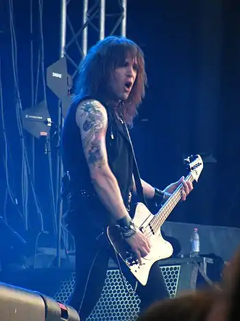 Gorham reformed Thin Lizzy in 2010 with former members Mendoza, Downey and Wharton, in addition to new guitarist Vivian Campbell and lead vocalist Ricky Warwick.[26] Campbell was replaced by Richard Fortus after returning to Def Leppard in mid-2011,[27] before Damon Johnson became his permanent replacement later in the year.[28] The band was put on hiatus in December 2012, when all members formed Black Star Riders,[29] before returning in 2016 with Mikkey Dee initially announced on drums.[30] Without performing with the band, Dee was replaced three months later by Judas Priest's Scott Travis, as Aerosmith's Tom Hamilton also replaced Mendoza.[31] In April 2019, Mastodon's Troy Sanders took over from Hamilton on bass.[32]