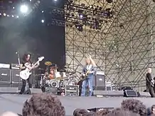 Thin Lizzy reformed in 1996, with Sykes taking over lead vocals and Marco Mendoza joining on bass, alongside returning members Gorham, Wharton and Downey.[15] Tommy Aldridge replaced Downey in 1998, and Wharton left in 2001 to focus on his own band Dare.[16] Mendoza and Aldridge left in 2003 to join Whitesnake,[17] with their places taken by Guy Pratt and Michael Lee, respectively.[18] Pratt was replaced later in the year by Randy Gregg.[19][20][21] Mendoza had returned to the band by early 2005,[22] as had Aldridge by early 2007.[23] Mendoza was replaced by Francesco DiCosmo later in 2007.[24] After more touring, Sykes departed Thin Lizzy in mid-2009, with DiCosmo and Aldridge leaving at the same time; speaking about the future of the band, Gorham claimed that "we will be back up to full speed soon".[25]