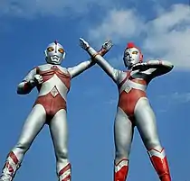 Ultraman 80 (ウルトラマン80, Urutoraman Eiti) is the eponymous protagonist of the series, an Ultra Brothers (ウルトラ兄弟, Urutora Kyōdai) candidate from Land of Light who was sent to Earth five years following Ultraman Leo's final fight.[1] Realizing that monster attacks were related to Minus Energy emissions from humans, 80 assumed the form of Takeshi Yamato (矢的 猛, Yamato Takeshi) and worked as a science teacher in Sakuragaoka Middle School to teach children about love and courage.[2] On the first day as a teacher, Takeshi's quick detection of the monster Crescent led to Ōyama recruiting him into the ranks of UGM after discussing the matters with the principal. From that day on, Takeshi led a triple life as either a schoolteacher on weekdays, UGM officer in weekends and after school and as Ultraman 80 when fighting monsters. Unfortunately, as the battle against monsters became more intense, Takeshi was forced to quit teaching at Sakuragaoka Middle School and became a full-time UGM member. In the final episodes of his series, he received assistance from his childhood friend Yullian and the two finally return to the Land of Light once the final monster, Margodon, was defeated by UGM themselves. By the time he returned to the Land of Light, 80 was officially recruited as a member of the Ultra Brothers.[1]