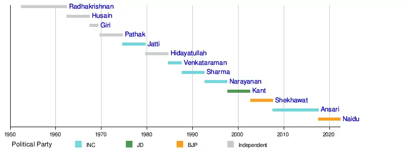 Venkaiah Naidu | 11 August 2017 | Incumbent | 4 years, 259 days | 2017 | Ram Nath Kovind | Bharatiya Janata Party | |