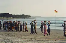 Some beaches are considered sacred and ritual processions are held on these. Sea temples are erected on the coasts of Bali, Lombok, and Java to appease the god or goddess of the Sea.[7][8] Some beaches on the southern coast of Java are considered sacred because of their association with the figure of Nyai Roro Kidul, Queen of the Southern Sea. In accordance with Javanese beliefs, people are warned not to wear green clothes on these beaches because the color is sacred to her and wearing it may offend her and cause the person to drown into the sea.[8][9][10] Rituals are enacted on beaches such as Parangtritis, Pangandaran, Karang Bolong Beach, Ngliyep, Puger, and Banyuwangi.[8][10]