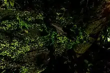 Bioluminescent fungi emit a greenish light at a wavelength of 520–530 nm. The light emission is continuous and occurs only in living cells.[4] No correlation of fungal bioluminescence with cell structure has been found. Bioluminescence may occur in both mycelia and fruit bodies, as in Panellus stipticus and Omphalotus olearius, or only in mycelia and young rhizomorphs, as in Armillaria mellea.[5] In Roridomyces roridus luminescence occurs only in the spores, while in Collybia tuberosa, it is only in the sclerotia.[6]