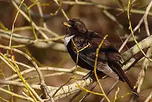 This list of birds of Wales includes every species of bird that has been recorded in a wild state in Wales. Compared to the avifauna of Britain as a whole, Wales has fewer breeding species, but these include a number of moorland species such as red grouse and black grouse, large numbers of seabirds (particularly on offshore islands such as Skomer, Grassholm and Bardsey) and good populations of several species typical of Welsh oak woods including redstart, pied flycatcher and wood warbler.[2][3] Among the birds of prey is the red kite, which had become extinct in other parts of Britain until being reintroduced recently.[1] In winter many wildfowl and waders are found around the coast, attracted by the mild temperatures.[2] In spring and autumn a variety of migrant and vagrant birds can be seen, particularly on headlands and islands.[2] Three-quarters of the UK population of the red-billed chough resides in Wales.