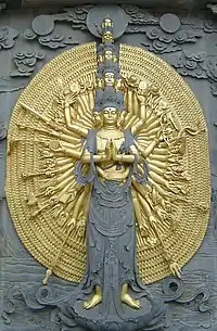 Manifestations of Vajrapāṇi can also be found in many Buddhist temples in China, Korea and Japan as dharma protectors called the Niō (仁王) or "Benevolent Kings". They are two wrathful and muscular guardians of the Buddha standing today at the entrance of many Buddhist temples in East Asian Buddhism and are said to be dharmapala manifestations of Vajrapāṇi. They are also seen as a manifestations of Mahasthamaprapta in Pure Land Buddhism and as Vajrasattva in Tibetan Buddhism.[5] In some texts, he is also described as the manifestation of Sakka, the ruler of Tavatimsa Devas.[6]